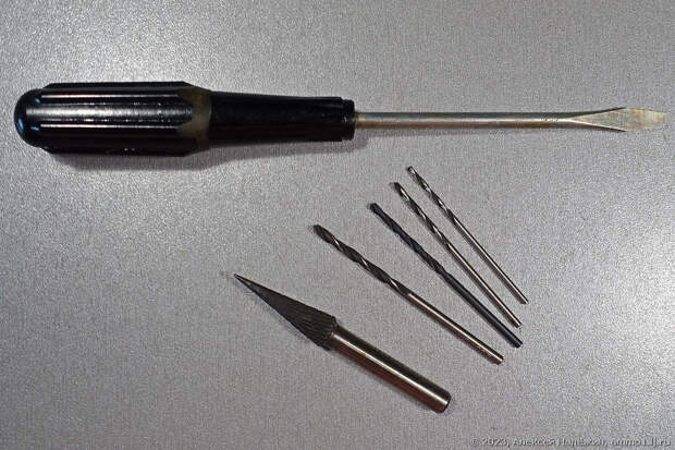Я купил новую советскую отвёртку с бакелитовой ручкой за 100 рублей, "шарошку" тоже за 100 рублей и четыре сверла по 25 рублей за штуку (одно из них с удивительным размером 2.55 мм).