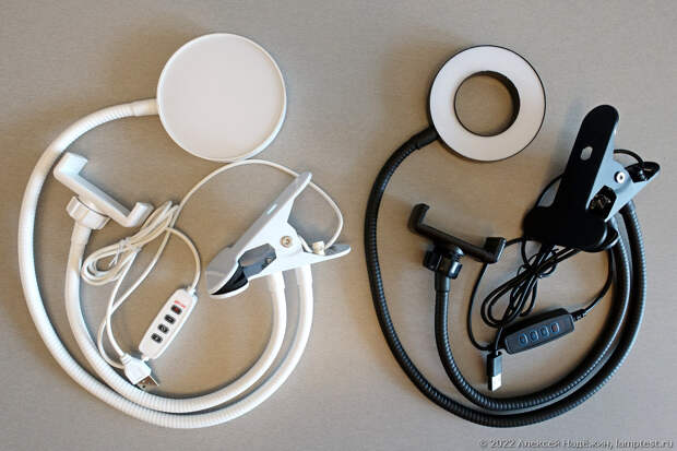 Эти лампы крепятся к столу на прищепку и имеют два гибких держателя - с лампой и креплением для смартфона. Часто их называют селфилампами или кольцевыми лампами, но использовать их можно и для предметной съёмки, и в качестве настольной лампы.