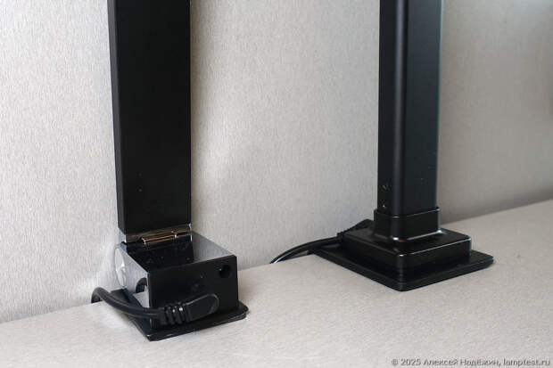 У PHX004 струбцина позволяет крепить светильник на столешнице, толщиной до 87 мм, настольная площадка имеет размер 65x70 мм. У PHX005 струбцина меньше, её можно закрепить на столешнице, толщиной до 48 мм, размер площадки 45x55 мм, провод от блока питания подключается не сзади, а спереди. Замечу, что у обоих светильников провод от блока питания можно подключать как к разъёму в струбцине, так и к разъёму плафона.