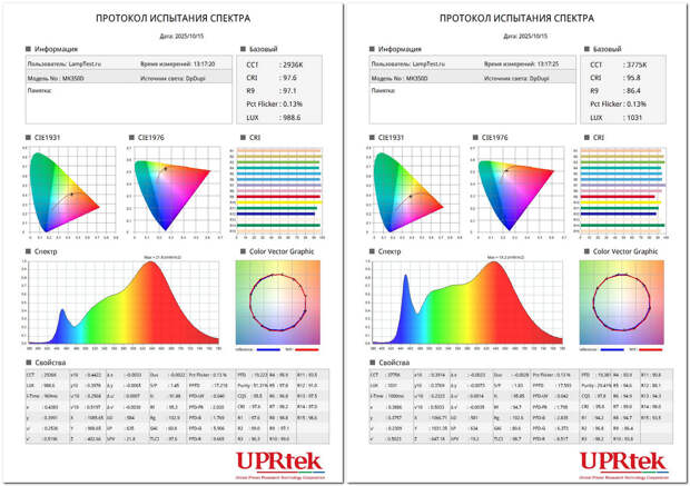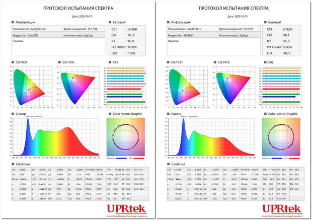 Я измерил параметры света на уровне стола, когда плафон поднят на высоту 60 сантиметров. Для измерения использовался спектрометр Uprtek MK350D.