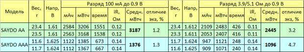 - разряд до 0.9 В эквивалентом сопротивления 3.9 Ом для АА и 5.1 Ом для ААА.