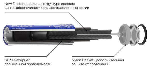 По информации производителя в батарейках применяется дополнительный нейлоновый уплотнитель для защиты от протечек и новейшие материалы, увеличивающие ёмкость и нагрузочную способность батареек.