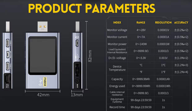 Основные параметры приведены на картинке производителя. Заявлена точность измерения напряжения 0.2%, тока и мощности 0.5% (на "+2" можно не обращать внимание, так как отображается до пяти знаков после запятой).