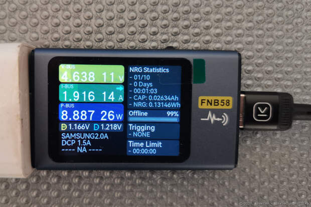 Помимо высокой точности измерения, несомненный плюс тестера - режим осциллографа, позволяющий безошибочно определить качество источников питания и зарядных устройств. Главный минус для меня - очень мелкое отображение энергии (Ач и Втч). Мне кажется при таком огромном экране отображение можно было сделать более крупным и удобным.