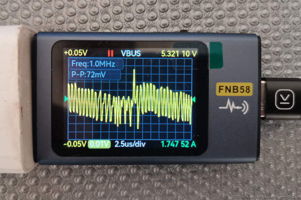 FNIRSI FNB58 - один из первых USB-тестеров, в котором помимо множества других функций, есть встроенный осциллограф для контроля пульсаций напряжения.