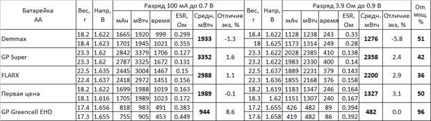 Я протестировал два экземпляра батареек и сравнил результаты с ранее полученными результатами тестирования щелочных батареек GP Super, FLARX, батареек ECO-Alcaline «Первая цена» из Галамарт и солевых батареек GP Greencell EHD.