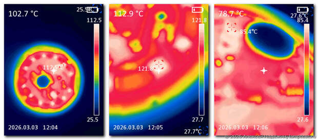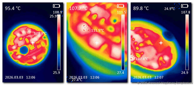 Тепловизор неточно измеряет температуры работающих светодиодов, но всё же оценить тепловой режим с его помощью можно. Измерения проводились сразу после снятия колпака-светорассеивателя после 30-минутной работы лампочки цоколем вниз.