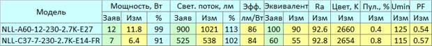 Все измерения проводились после тридцатиминутного прогрева ламп.Результаты теста: