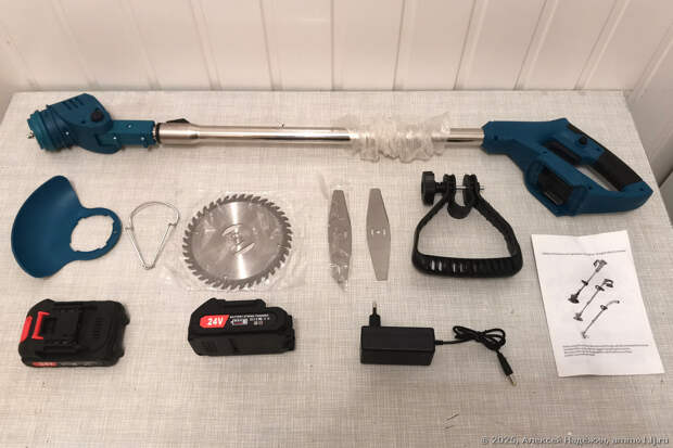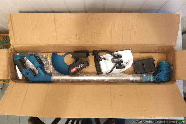 На странице товара обещали комплект с одним аккумулятором и тремя типами ножей (дисковая фреза, два металлических, пять пластиковых). Фактически, пластиковых ножей нет, зато аккумулятора два. В комплекте отсутствует одна необходимая деталь (винт крепления пластиковой защиты) и две желательных (шайба и ключ крепления ножа). Возможно пакетик с этими деталями был, но выпал через одну из дыр коробки.
