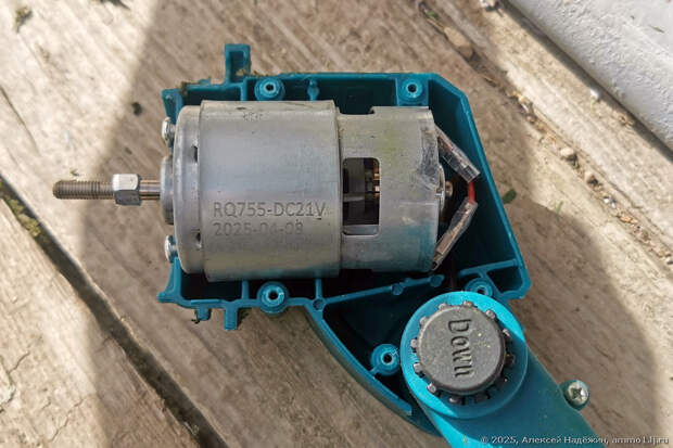 Конструкция триммера предельно проста. Используется большой мощный коллекторный (щёточный) двигатель RQ755-DC21V (диаметр 45 мм, длина 60 мм), на вал которого и крепится нож.