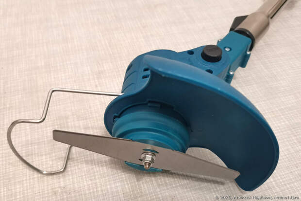 Штанга телескопическая, косящая головка с мотором может устанавливаться в одно из трёх положений угла относительно штанги. Есть передняя защита из толстой проволоки. Нож крепится на пластиковую чашку (под гайкой должна быть большая шайба, но её не положили или потеряли в процессе доставки).