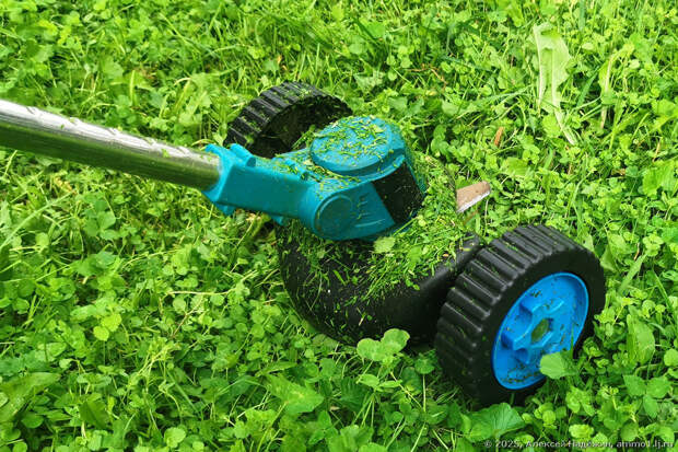 До этого я изучал подобный триммер с 12-вольтовым аккумулятором, вставляющимся в ручку. Вот там мощности радикально не хватало - мотор постоянно застопоривался при обычном кошении, а кошение с колёсами было фактически невозможным. Оказалось, что мощность 18-вольтового триммера вдвое больше.