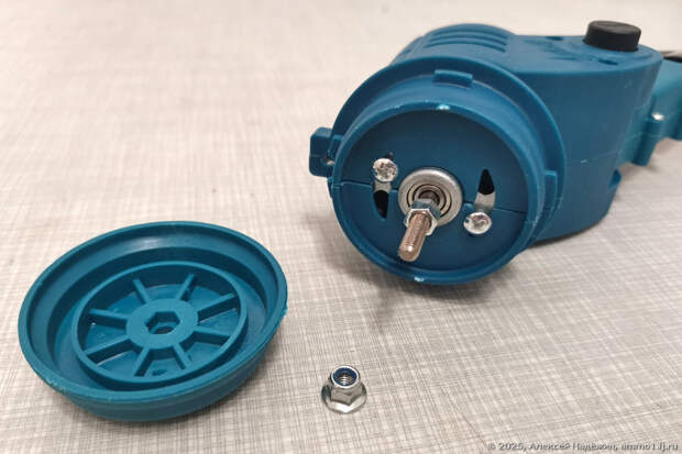 Пластиковая чашка, заодно защищающая двигатель от кусочков травы, сверху имеет выступы для фиксации ножа, а снизу прорезь под гайку.