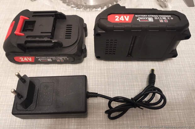 На аккумуляторах написано "24V", на самом деле это обычные 18-вольтовые аккумуляторы, совместимые с Makita (иногда их помечают 20V или 21V, так как напряжение на пяти, включённых последовательно, литиевых ячейках формата 18650 в процессе разряда снижается с 21 до 15 В, а 18 В это среднее напряжение).