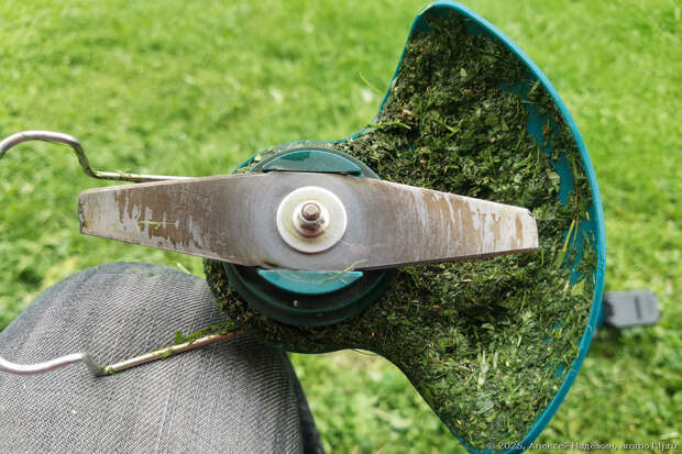 На ноже после сорокаминутного кошения появились выбоины от неизбежных встреч с камнями (замечу, что ножи и насадки с тросиками и лесками продаются и стоят недорого).